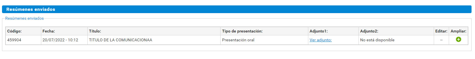 Verá entonces la relación de su/s comunicación/es. En el lado derecho del título de su trabajo le aparecerá un signo + y si pincha en él, accederá al contenido de su resumen.